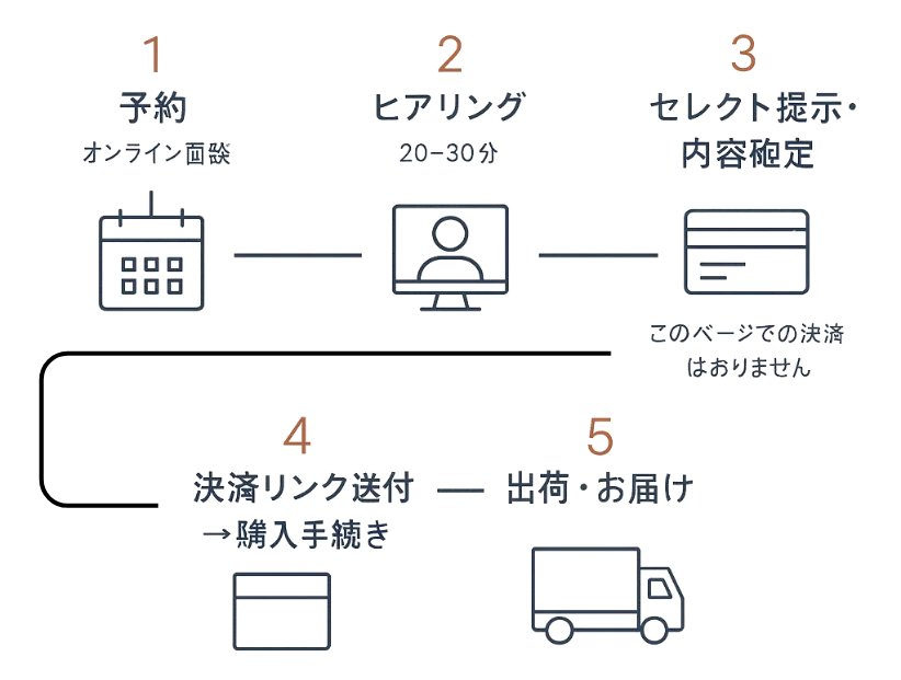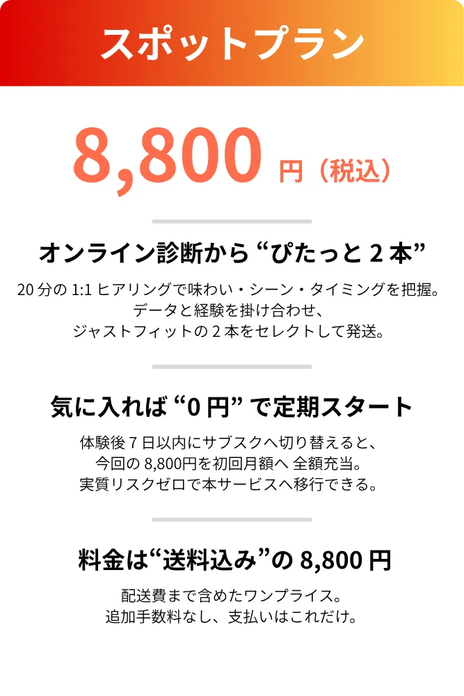 「いつほしいか」「どんな味・色か」「どんなシーンか」までオンラインセッションで聞きとり、専用に仕立てた 1 本をセレクトしてお届けします。