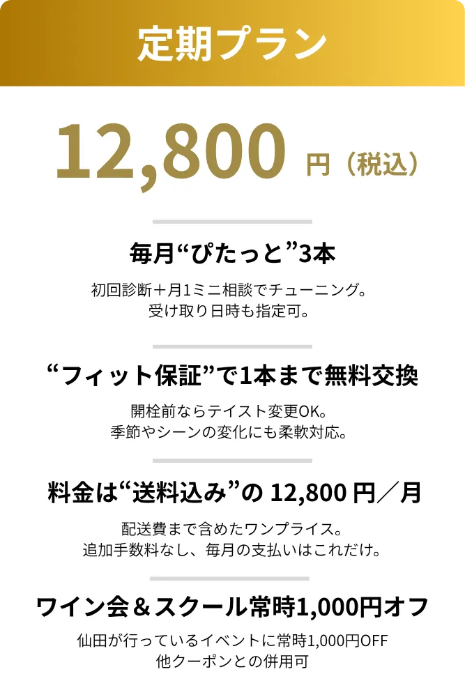 • 自宅でゆっくり、仲間との乾杯、ギフト用…目的に合わせて最適化好みを聞いて、すべて仕立てる。だから迷わない。